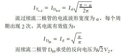 加了續流二極管后其輸出電壓波形V3與不加續流二極管時相同。原先流經橋臂上元件的續流電流變成通過二極管續流。各原件中流過的電流波形和變壓器副邊電流波形明顯有一定的間隔。每個周期中流過晶閘管T1T2D8D9的電流波形寬度都是π—α,其電流有效值為(Id為負載電流)