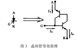 晶閘管的結構相當于串級雙晶體管模型PNPN4層結構,因而具有3PN結,分別引出陽極A,陰極K,門極G。在圖3結構里無論在PNPNPN晶體管的AK端點施加正向電壓還是反向電壓,其中的PNPN結構都處于高阻阻斷狀態,只通過很小正向漏電流或很小的反向漏電流,與一般二極管的反向特性相似。一旦門極電流Ic注入G點,就會由于形成強烈的正反饋導致PNPNPN進入完全飽和狀態,即晶閘管飽和導通。