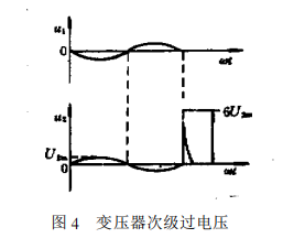 另一方面,直流屏變壓器交流側也會由于大容量負載如大變比變壓器的合閘瞬間、其它負載切斷電源時以及整流變壓器電刀閘的開關斷開,也會由于初次級繞組間的分布電容,變壓器的激勵電流的突變在次級產生瞬時過電壓,其尖峰值可達工作電壓峰值的6倍以上,如圖4所示。